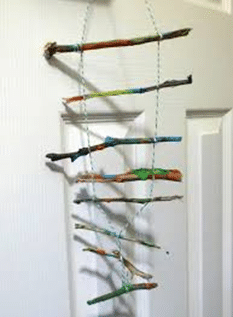 First of all, paint your sticks any colours you like, the brighter the better, then leave them to dry. Then with string you can tie them together to make a stick mobile (if you use waterproof paint or seal them, they can be hung outside). You can even paint leaves that you have collected on your walk to hang from some of the sticks.