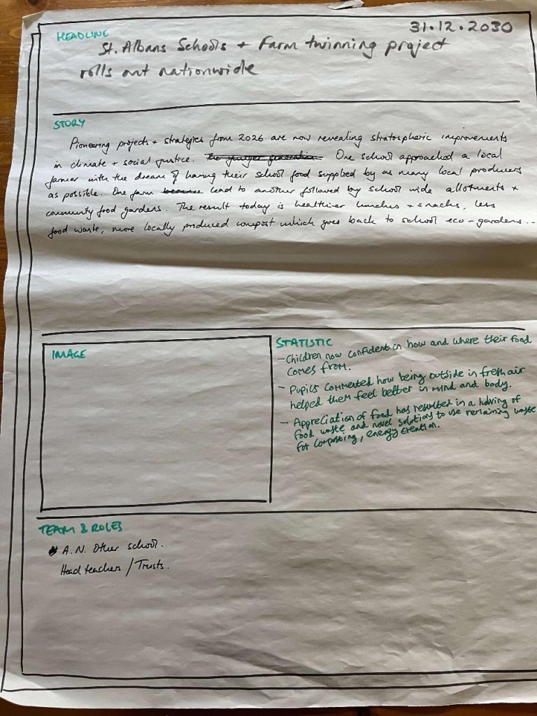 The final group imagined a partnership between schools and local farms. Children regularly visited farms that also supplied school meals, learning exactly how their school dinner gets onto their plate. As a result, food waste halved, with scraps being composted or used for energy. The children now had a clear idea of where their food comes from and felt healthier and happier from being out in the fresh air.