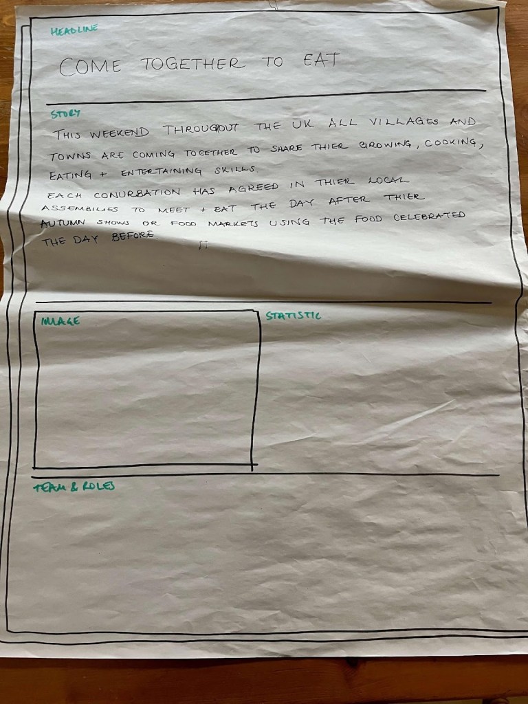Food was the focus for group three. All over the UK, residents came together to celebrate their shared growing, cooking and entertaining with an Autumn show or food market. The next day, all the food was consumed at a large local feast. Meals naturally became more plant-based without any need for explicit conversation because people were growing fruit and vegetables. This led to people valuing food more and reducing waste.