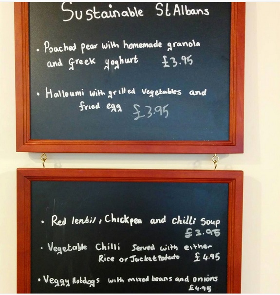 Quakers home produce sale, Cafe on the Corner vegetarian menu, Eat Wholefoods offer, Beer Shop reusable flagon offer, veg at Food Smiles St Albans.
